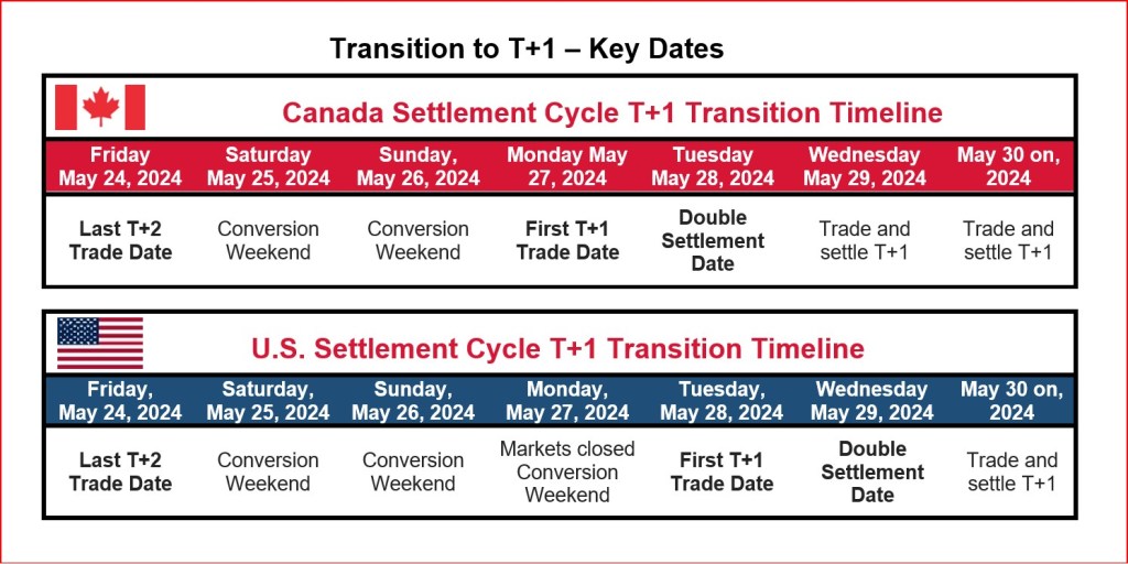 Хорошие новости для инвесторов! С понедельника 27-го мая 2024 года Канада и со вторника 28-го мая 2024 года США переходят на T+1 при операциях с: